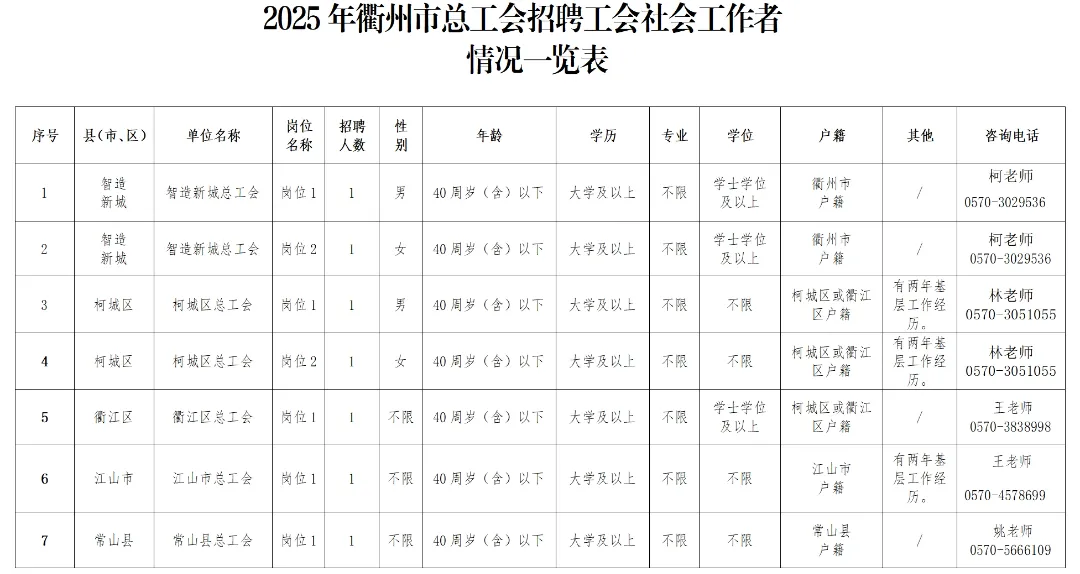 公告未盡事宜,由衢州市總工會(huì)負(fù)責(zé)解釋。如有疑問,可根據(jù)報(bào)考崗位對(duì)應(yīng)咨詢,聯(lián)系電話:
